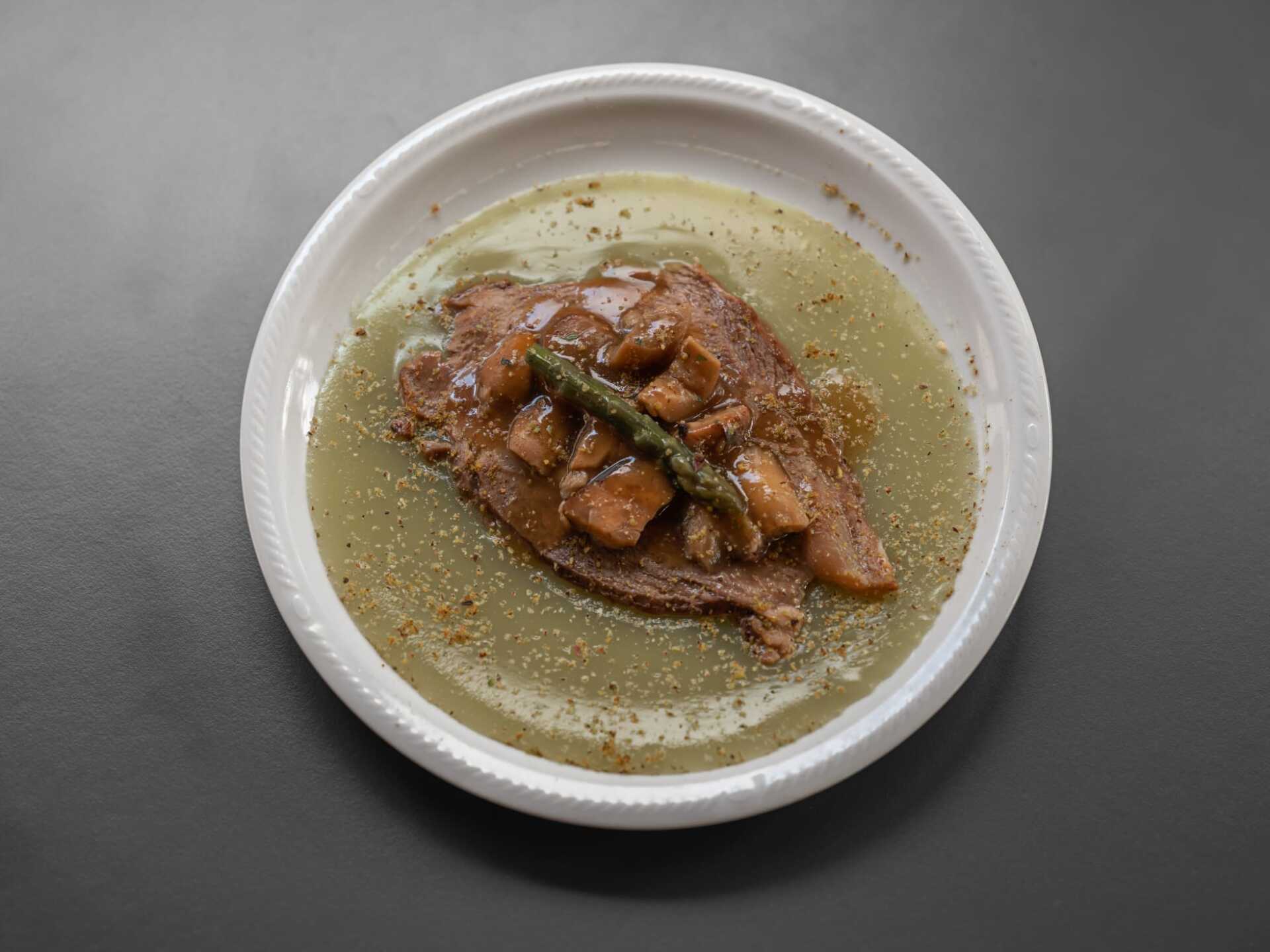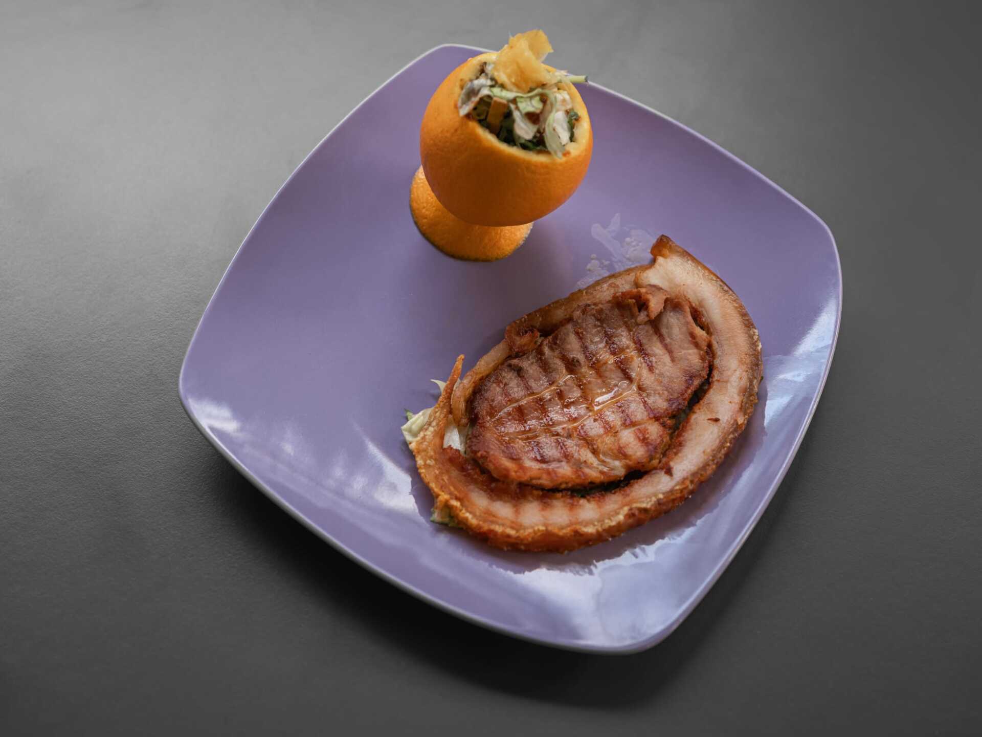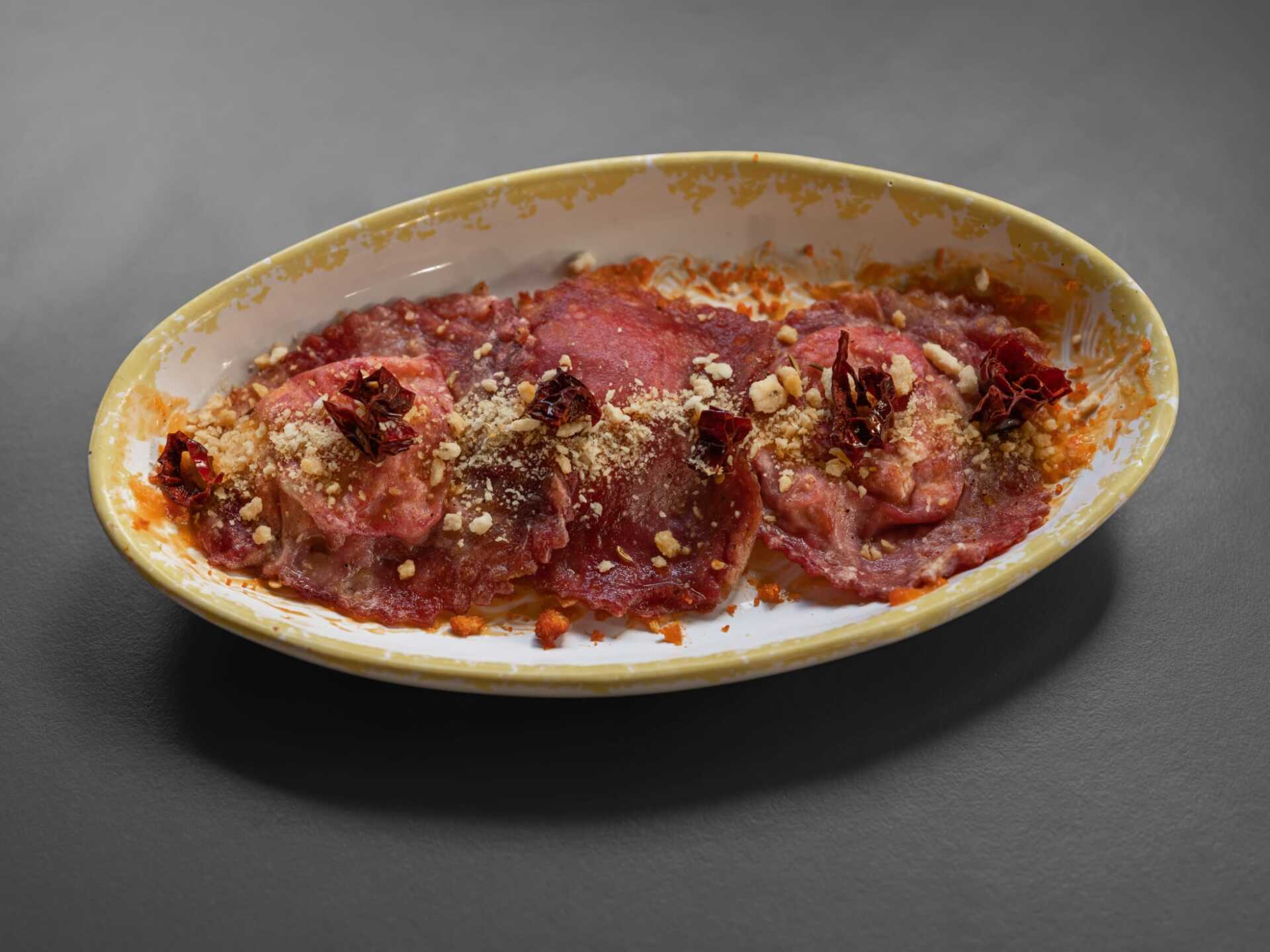 Girellona di crespelle salate al peperone crusco ripiene di salsiccia pezzente, stracciatella e caciocavallo podolico allo zafferano di Ripacandida. Un piatto robusto che merita l’assaggio, accompagnato magari da un buon Aglianico di Rionero che ne addolcisce il sapore deciso.